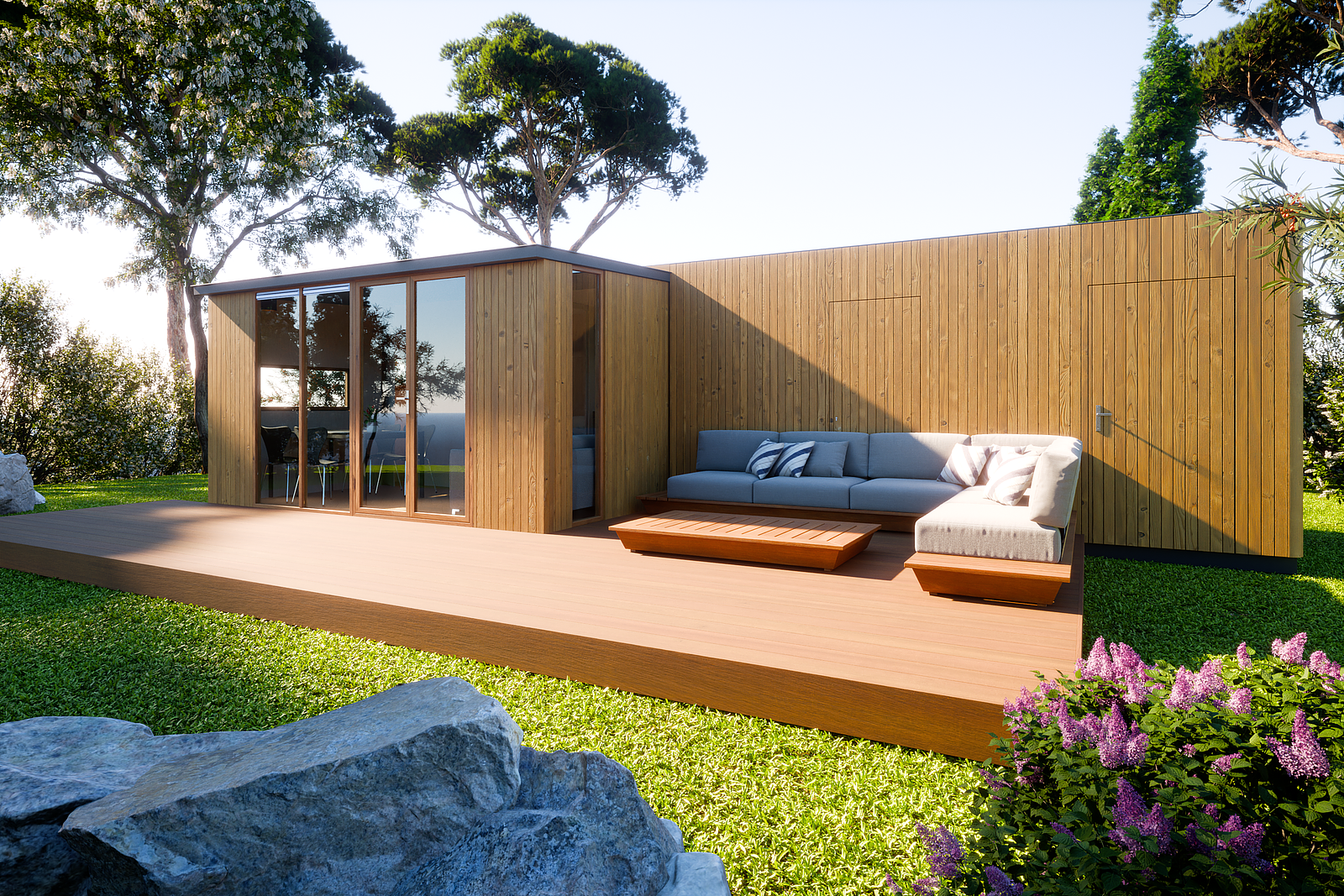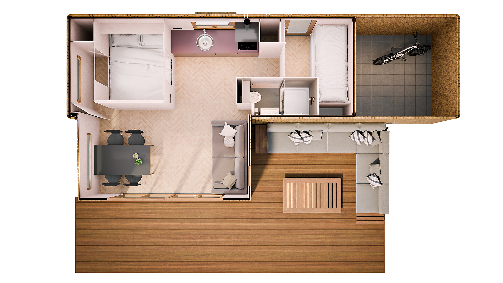 Dankzij de L-vorm ontstaat ongeveer 24,0 m² leefruimte, ideaal voor meerdere personen die samen willen genieten. Daarnaast is er een berging in dezelfde stijl als het Klapkot van 2,5 × 2,5 meter.