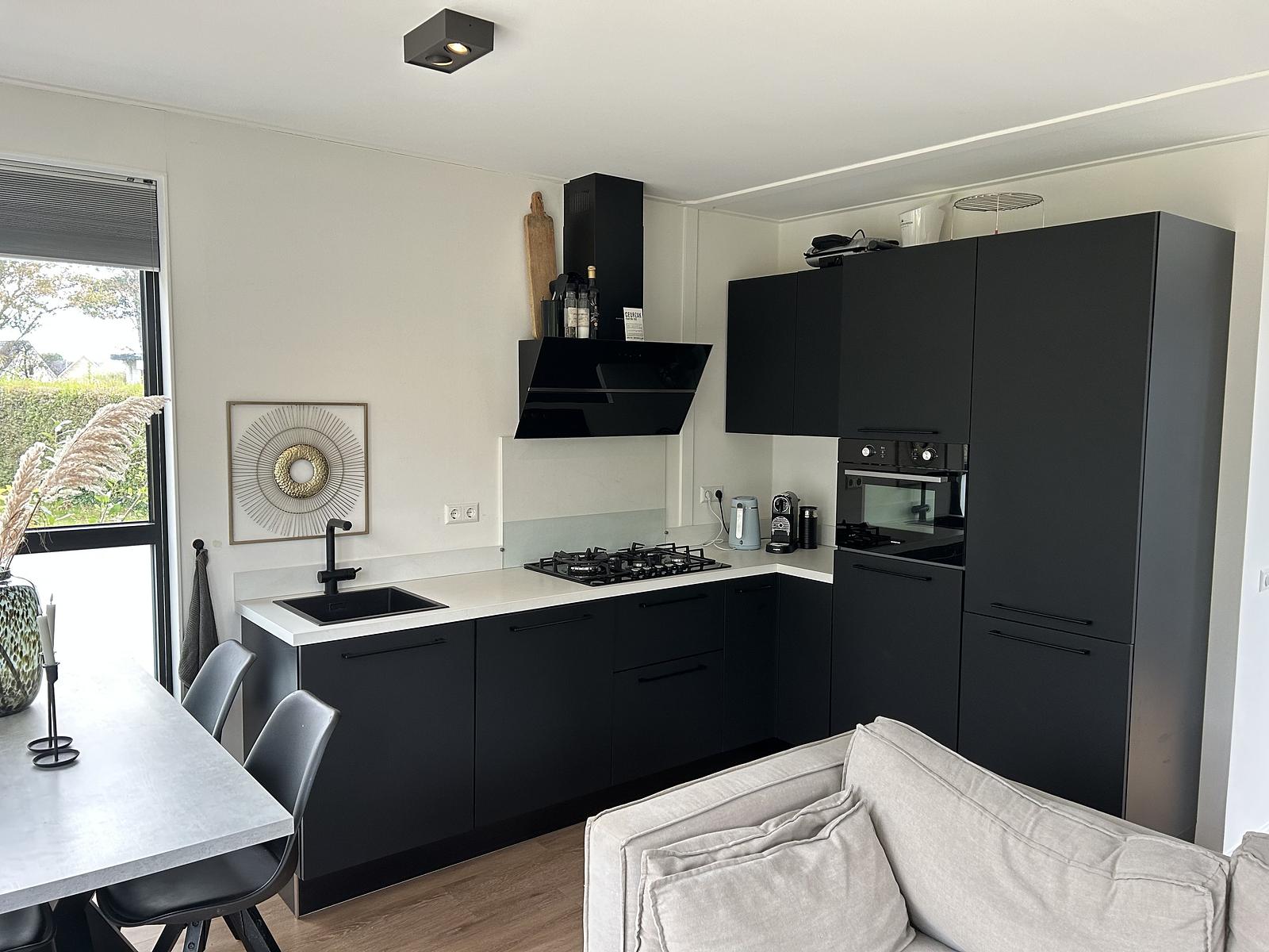De donkere keuken straalt luxe uit en is voorzien van o.a. een 6-pits gasfornuis, oven, koelkast en vriesvak en veel opbergruimte.