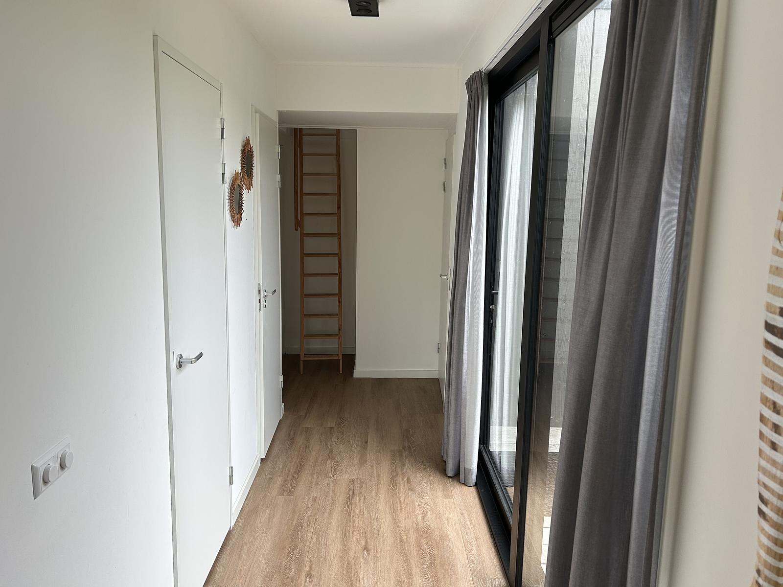 Via een grote schuifpui kom je binnen in de hal vanwaar je toegang hebt tot de diverse ruimtes. De woonruimte heeft zeer veel lichtinval en biedt ruimte voor 6 personen en grenst aan de openslaande deuren naar het terras. Het grote raam aan de west-kant is voorzien van een elektrisch bedienbaar screen.