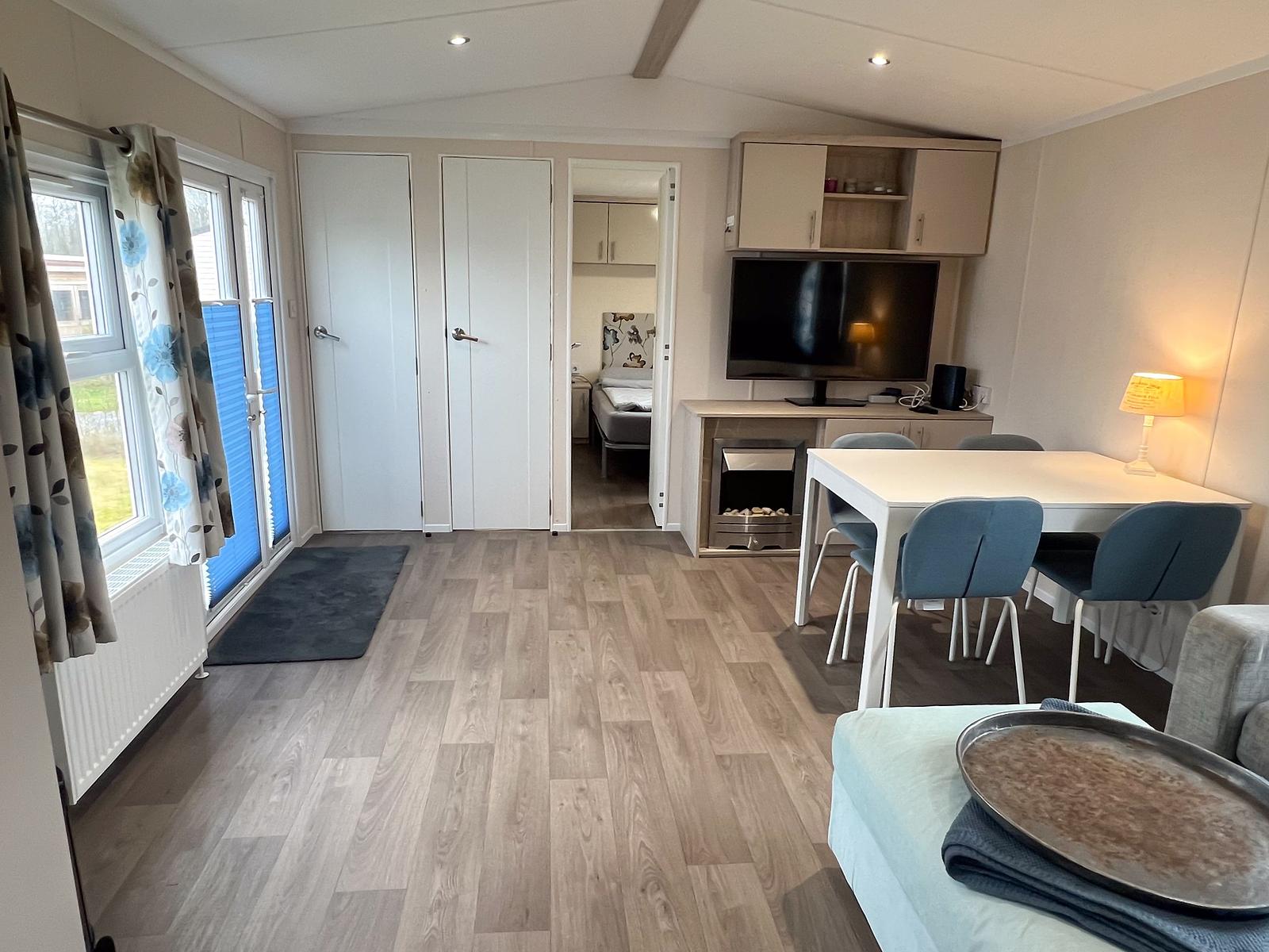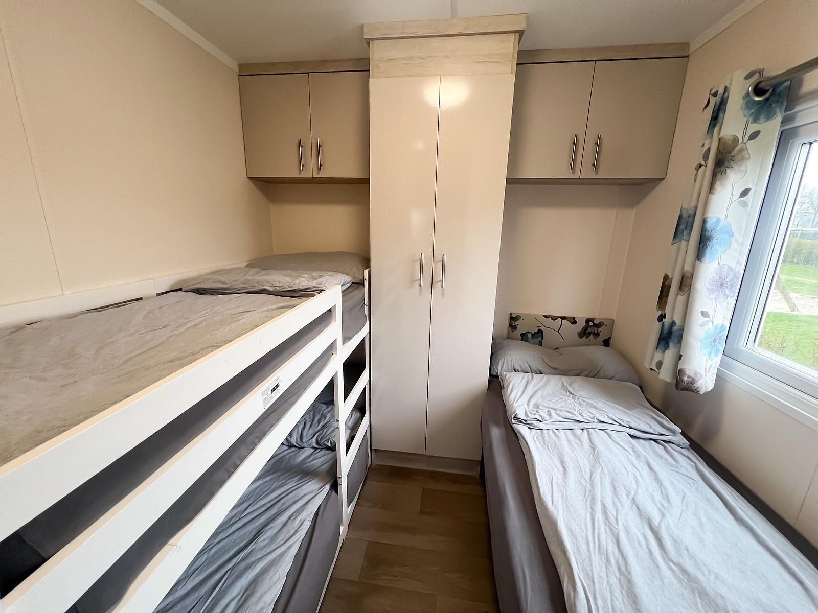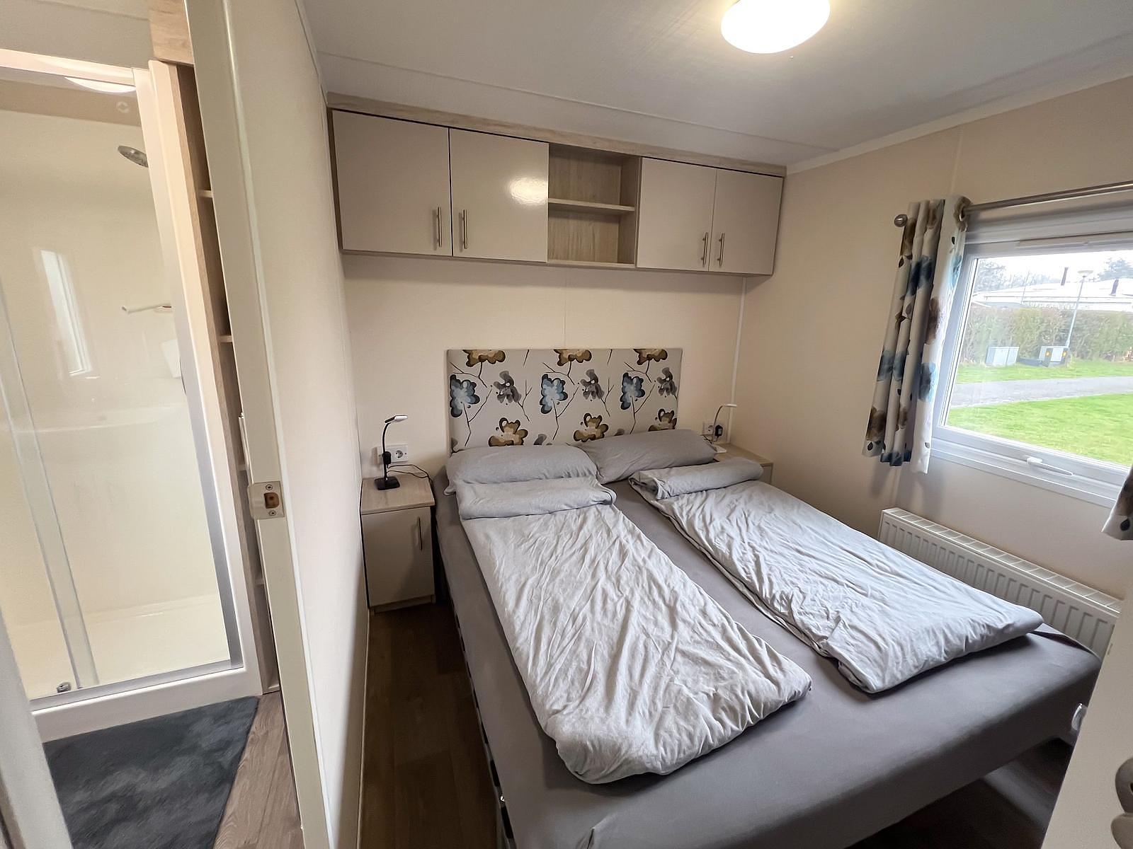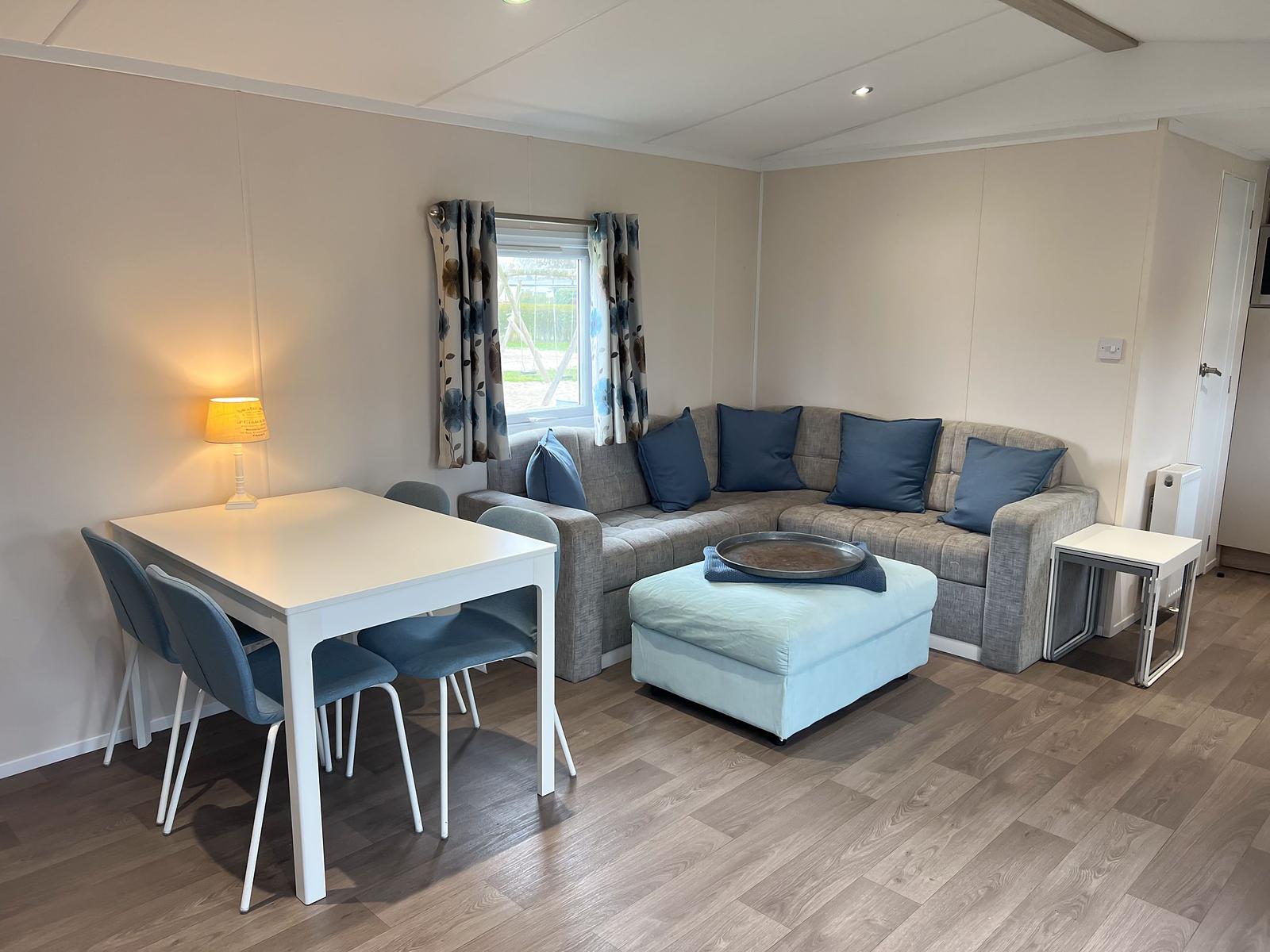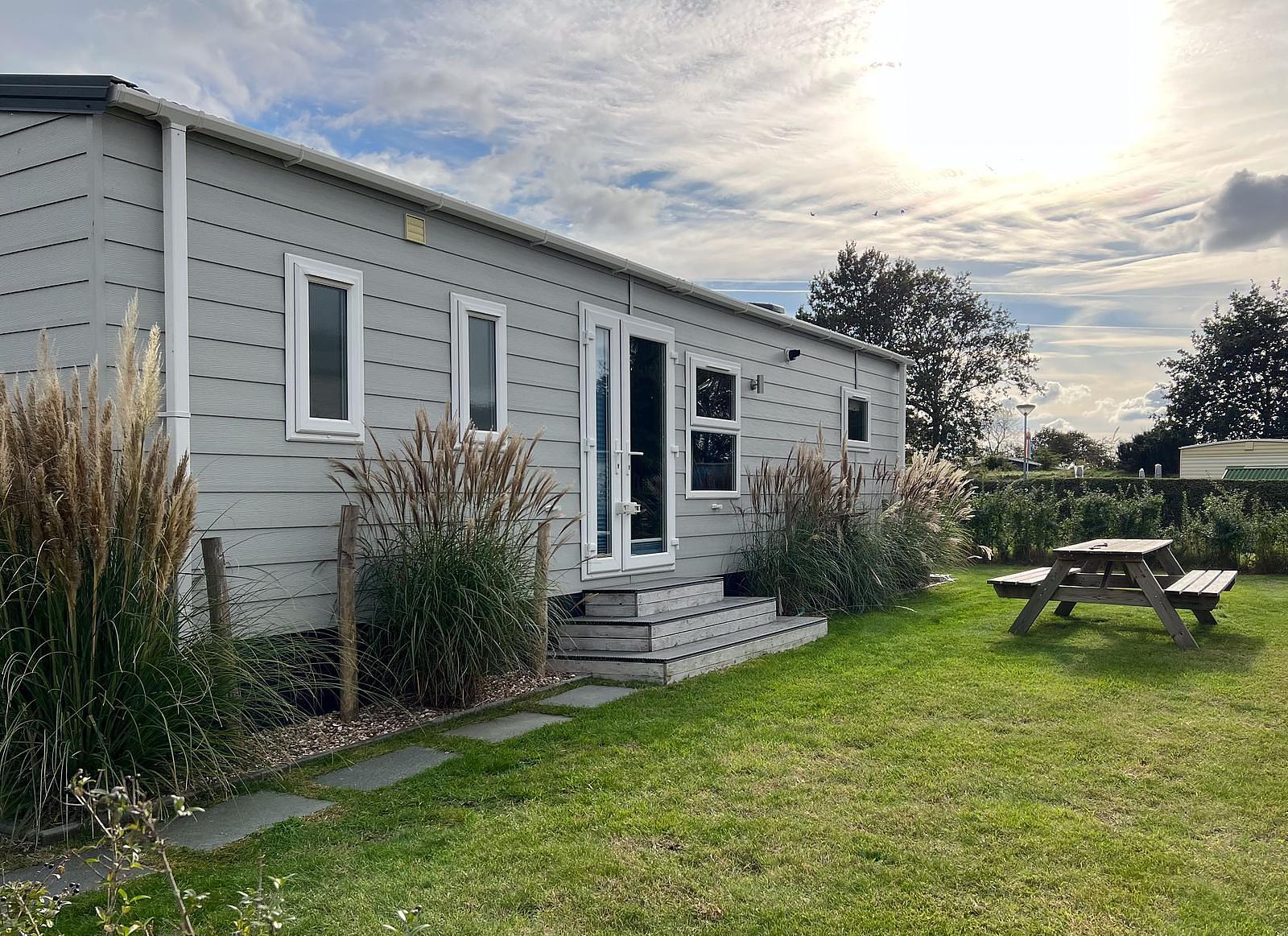 Dit chalet van 11 x 4 meter is geplaatst in 2020 en staat op een perceel van circa 170 m². Het chalet heeft een knusse woonkamer en eethoek, centraal gelegen, met een gashaard. Aan weerszijden vind je een slaapkamer waarvan één is uitgerust met een tweepersoonsbed en de andere met een stapelbed en enkel bed, zo kunnen 5 personen comfortabel slapen in dit chalet. Er is tevens voldoende kastruimte aanwezig in beide kamers. De keuken is van alle gemakken voorzien, met een 4-pits fornuis, een koelkast met vriesvak en veel kastruimte.