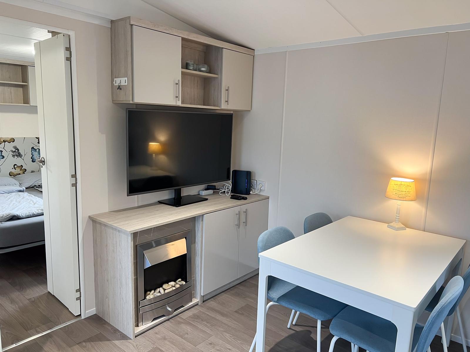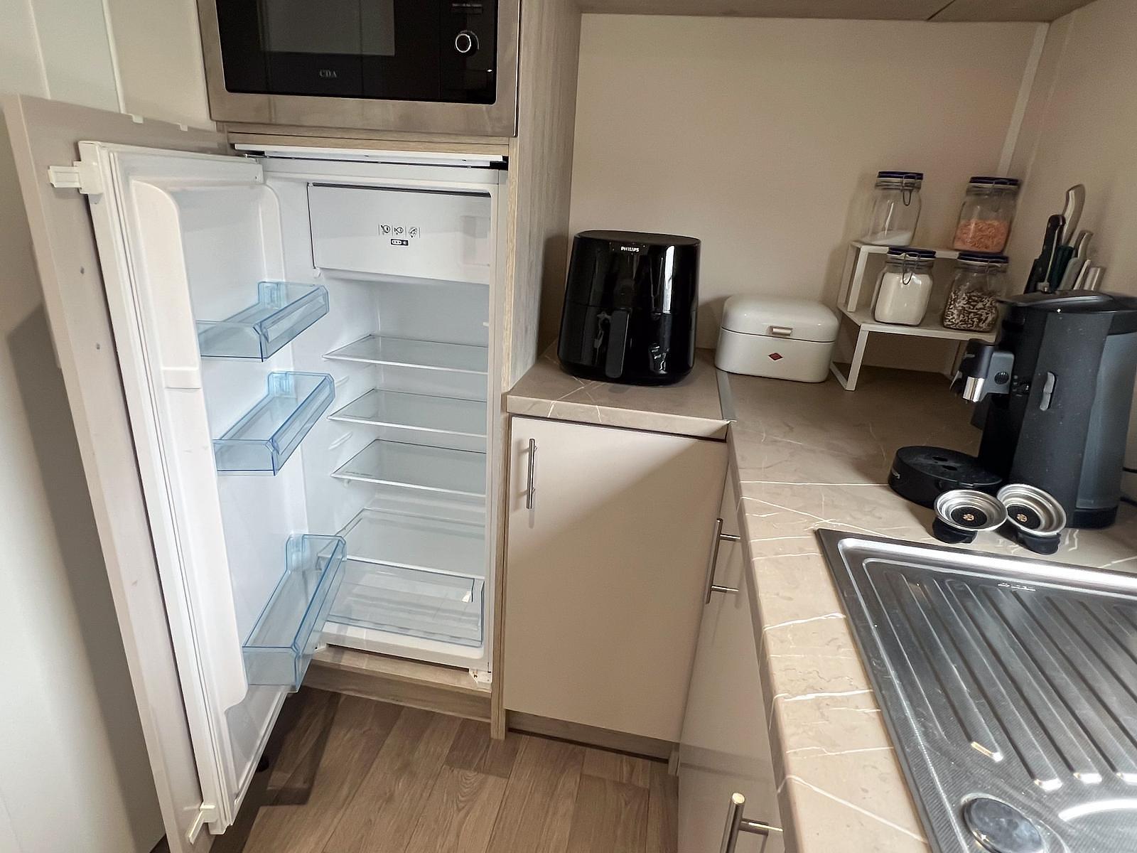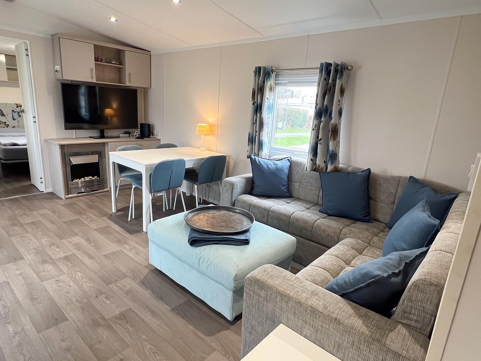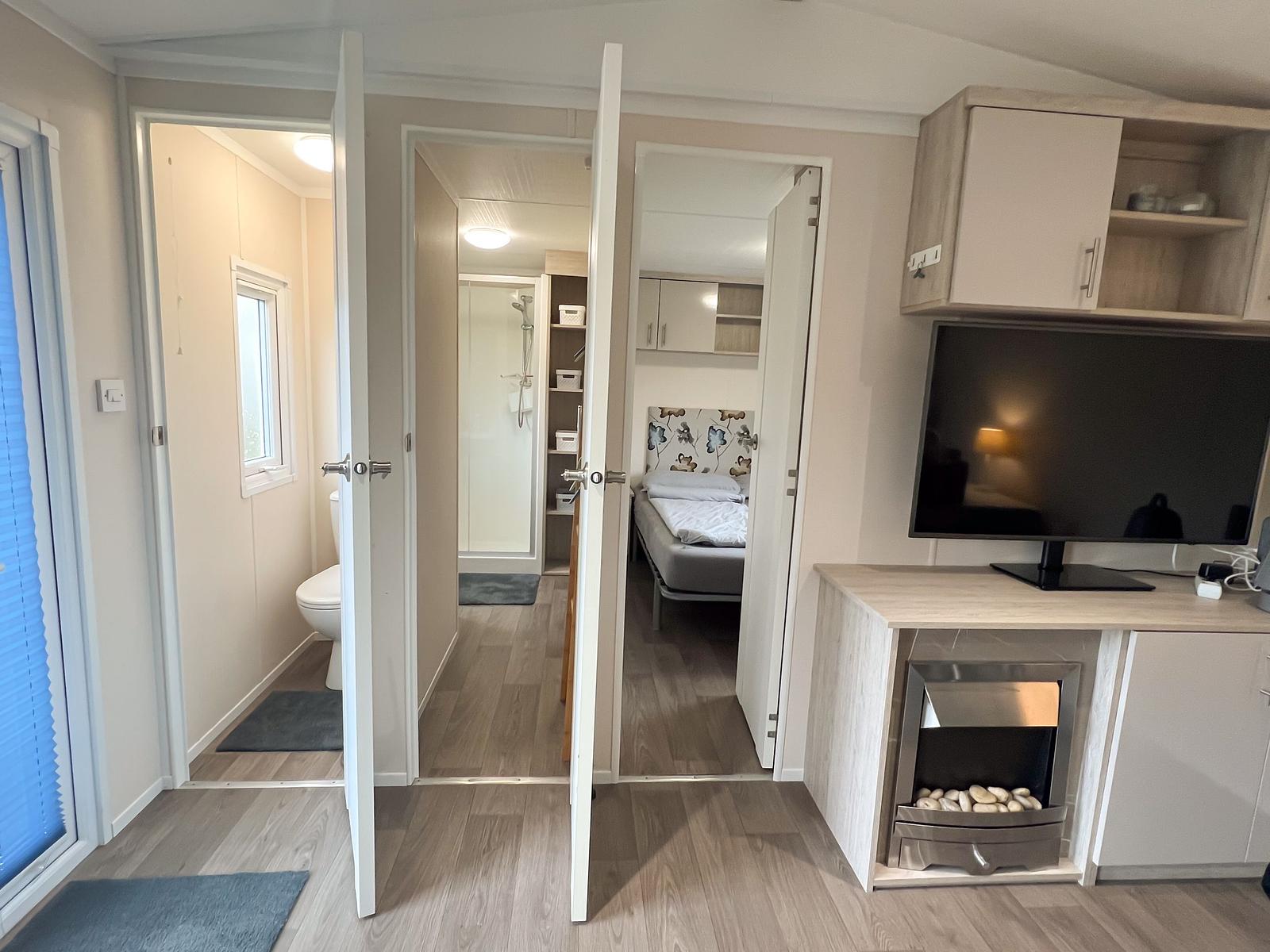 Dit chalet van 11 x 4 meter is geplaatst in 2020 en staat op een perceel van circa 170 m². Het chalet heeft een knusse woonkamer en eethoek, centraal gelegen, met een gashaard. Aan weerszijden vind je een slaapkamer waarvan één is uitgerust met een tweepersoonsbed en de andere met een stapelbed en enkel bed, zo kunnen 5 personen comfortabel slapen in dit chalet. Er is tevens voldoende kastruimte aanwezig in beide kamers. De keuken is van alle gemakken voorzien, met een 4-pits fornuis, een koelkast met vriesvak en veel kastruimte.
