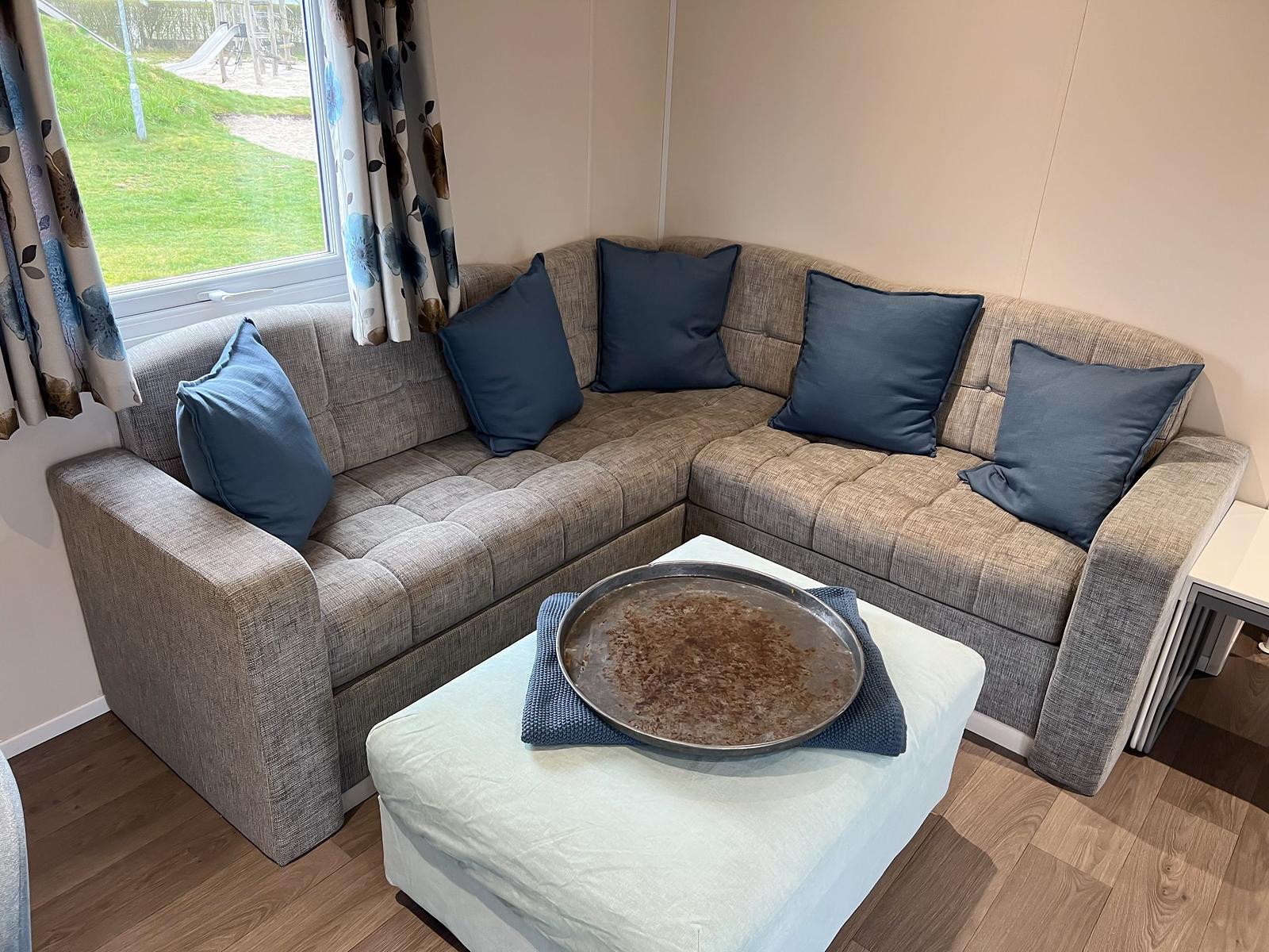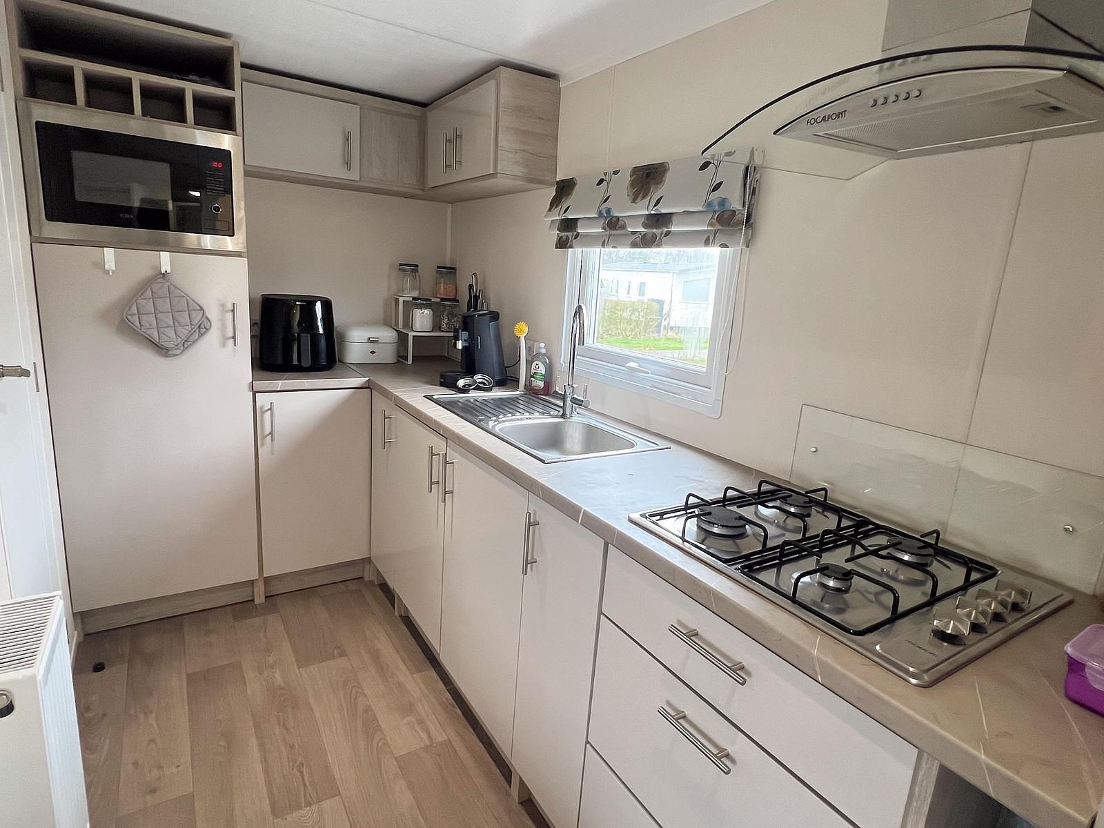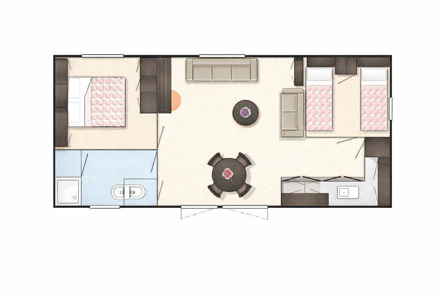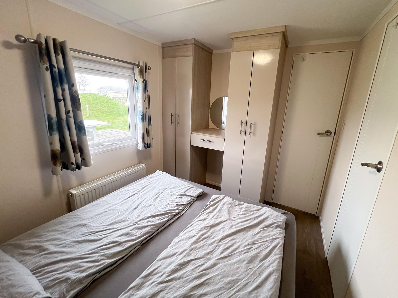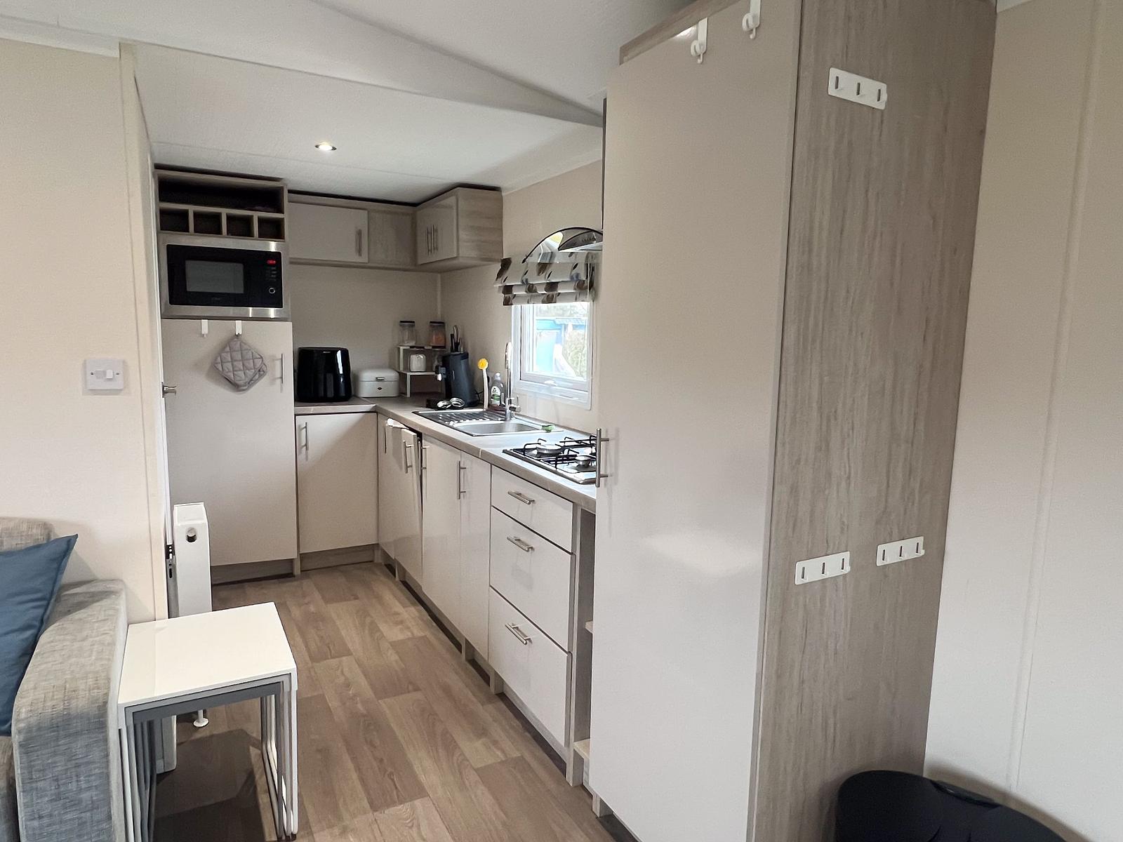 Dit chalet van 11 x 4 meter is geplaatst in 2020 en staat op een perceel van circa 170 m². Het chalet heeft een knusse woonkamer en eethoek, centraal gelegen, met een gashaard. Aan weerszijden vind je een slaapkamer waarvan één is uitgerust met een tweepersoonsbed en de andere met een stapelbed en enkel bed, zo kunnen 5 personen comfortabel slapen in dit chalet. Er is tevens voldoende kastruimte aanwezig in beide kamers. De keuken is van alle gemakken voorzien, met een 4-pits fornuis, een koelkast met vriesvak en veel kastruimte.