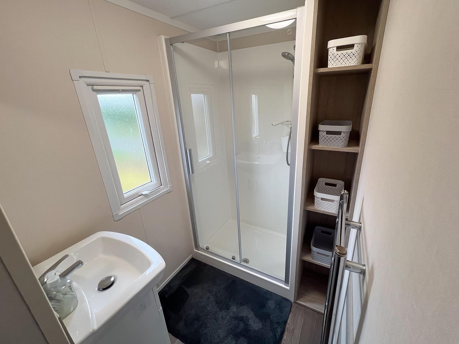 Naast de entree bevindt zich een stijlvol ingerichte badkamer welke is uitgerust met een douche, een wastafelmeubel, het toilet is apart.